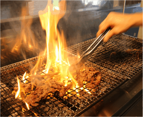 自動で焼き上がります。焼き加減を標準化し、調理時間の短縮につなげています。仕上げに直火で網焼きをして香ばしさを加えることにより、提供時間3 分を実現しています。